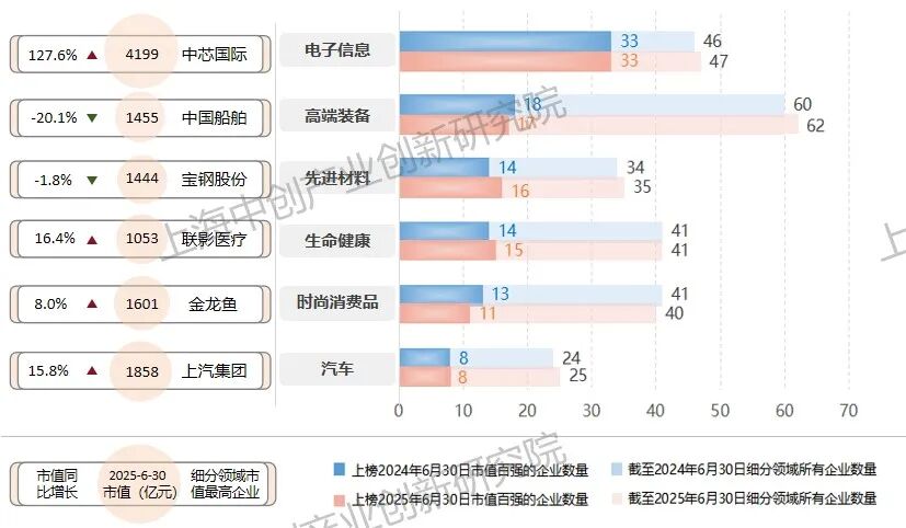 从行业分布来看,上海制造业市值百强企业约三成集中在电子信息领域,本期共有33家上榜企业,在榜企业总市值规模明显提升,较去年同期增长56.0%,是市值增幅最高的细分领域。高端装备领域有17家企业上榜,较上期减少1家。先进材料领域有16家企业上榜,较上期增加2家,中洲特材、华峰超纤等多家上市企业市值成倍增长。生命健康领域有15家企业上榜,较上期增加1家,在榜企业市值规模总体增长18.2%。时尚消费品领域有11家上榜企业,较上期减少2家。汽车领域有8家企业上榜,上榜企业数量较上期保持不变。从“三大先导产业”维度看,集成电路、生物医药领域有较多高市值规模公司,分别有20、11家企业上榜市值百强,上榜市值百强的企业较上榜营收百强的企业数均更多;人工智能领域进入市值百强的企业数量虽和进入营收百强的相同,但企业排名更靠前,反映三大先导产业企业的市场关注度较高。