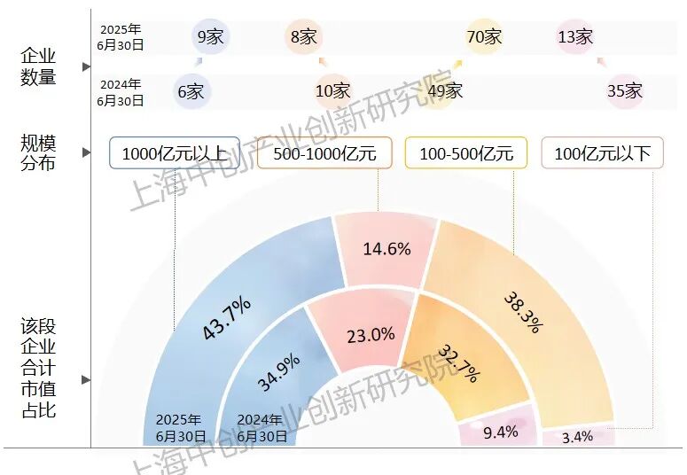2025年上半年底百强榜单企业市值规模合计为35065亿元,较2024年上半年底(27018亿元)增长29.8%。从规模分布来看,市值规模位于1000-5000亿元的有9家,较上期增加3家(中微公司、联影医疗、上海电气),榜首企业中芯国际本期市值超4000亿元,较上年同期增长127%;位于500-1000亿元的有8家,较上期减少2家;位于100-500亿元的有70家,较上期增加21家;位于100亿元以下的有13家,较上期减少22家。
