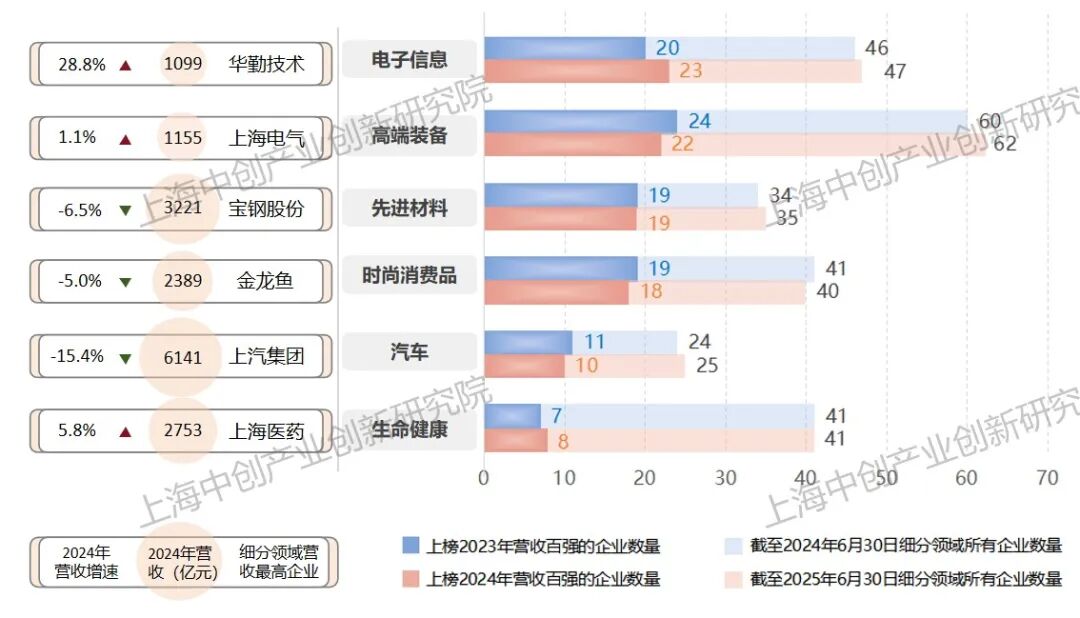 从行业分布来看,电子信息、高端装备、先进材料、时尚消费品领域企业在营收百强榜中占据较多席位,分别有23、22、19、18家企业上榜;汽车、生命健康领域上榜企业相对较少,分别有10、8家企业上榜。其中,电子信息领域企业营收能力有所增强,新增3家营收百强企业(澜起科技、恒玄科技、上海贝岭),超八成百强企业2024年营收实现正增长。高端装备领域企业盈利能力有待提升,本期营收百强企业减少1家,约四成百强企业2024年营收有所下滑。先进材料领域上榜企业与上期持平,实现正增长的企业居多,其中,合成生物企业凯赛生物重回百强榜单,2024年营收增速达39.9%。时尚消费品领域上榜企业较上期减少1家,过半数百强企业的业绩有所下滑,头部企业金龙鱼、老凤祥、光明乳业业绩承压态势进一步凸显。汽车领域上榜企业减少1家,头部企业上汽集团营收从七千亿级收缩至六千亿级,营收同比下降15.4%。生命健康领域上榜企业较上期增加1家,为肿瘤药物研发企业艾力斯,头部企业上海医药2024年业绩保持稳健增长。从“三大先导产业”维度看,集成电路上榜企业数增至14家(新增澜起科技、恒玄科技、上海贝岭),生物医药领域上榜企业增加1家(艾力斯),人工智能领域上榜企业数量仍较少,只有1家企业上榜(科大智能)。